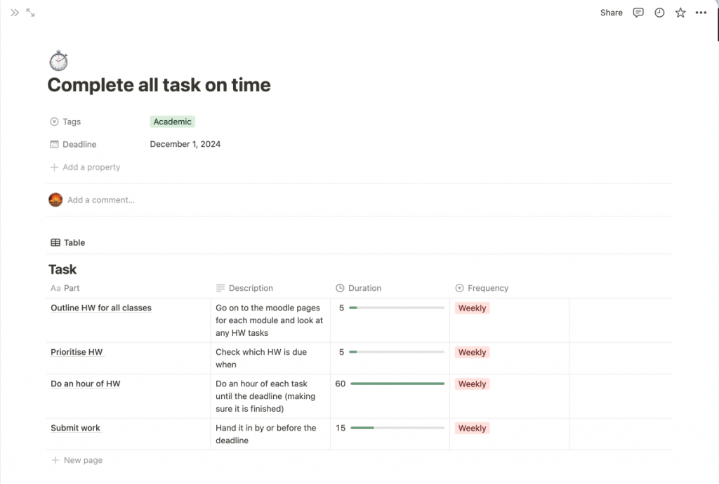 So, using Notion I created a new database to manage my goals. Then using the chucking method I broke my goals down into small achievable tasks